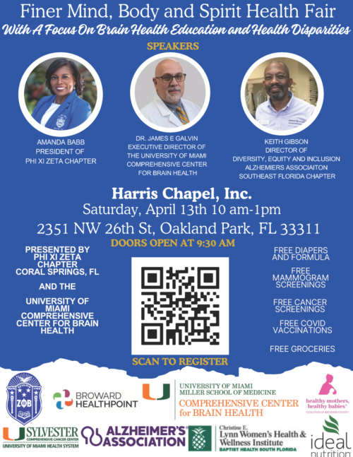 04.13.24 Finer Mind, Body and Spirit Health Fair Speakers. Join CCBH for a community health fair providing resources and education focused on Health Disparities and Brain Health. The event provides FREE HEALTH RESOURCES, including baby diapers and formula, mammogram screenings, cancer screenings, covid vaccinations, and groceries (while supplies last). Presenters include (1) Dr. James E. Galvin, Executive Director of the UM Comprehensive Center for Brain Health in Boca Raton. (2) Amanda Barb, President of Phi Xi Zeta Chapter. (3) Keith Gibson, Director of Diversity, Equity, and Inclusion at Alzheimer’s Association Southeast Florida Chapter. Registration is suggested due to limited supplies of resource giveaways.