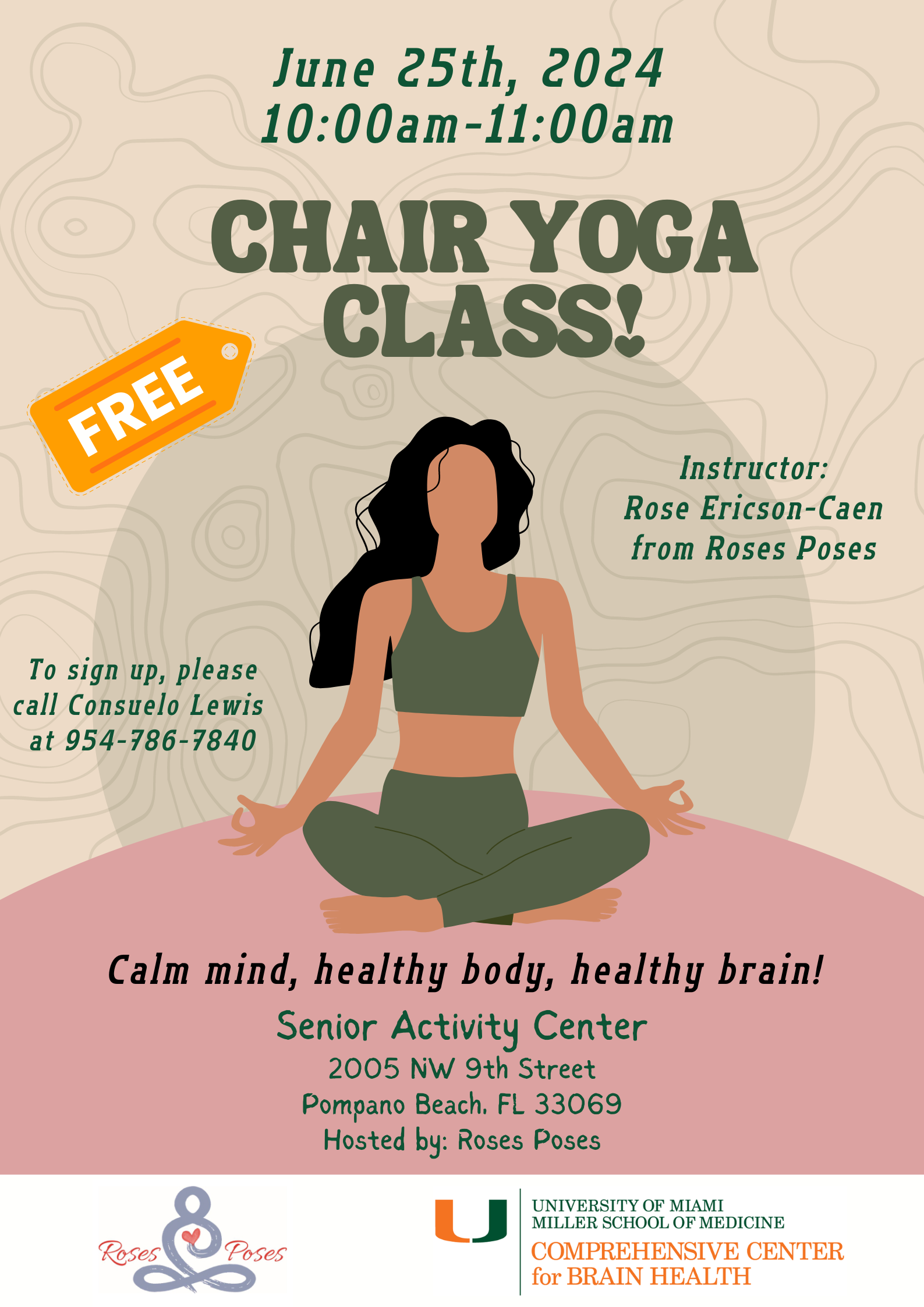Join a gentle yoga class to calm your mind, gently stretch your body, and boost your brain health. The class is structured for participants to be seated in a chair for the exercises. There are no standing or floor exercises for this class. Registration is required. Contact Consuelo Lewis 954-786-7840.